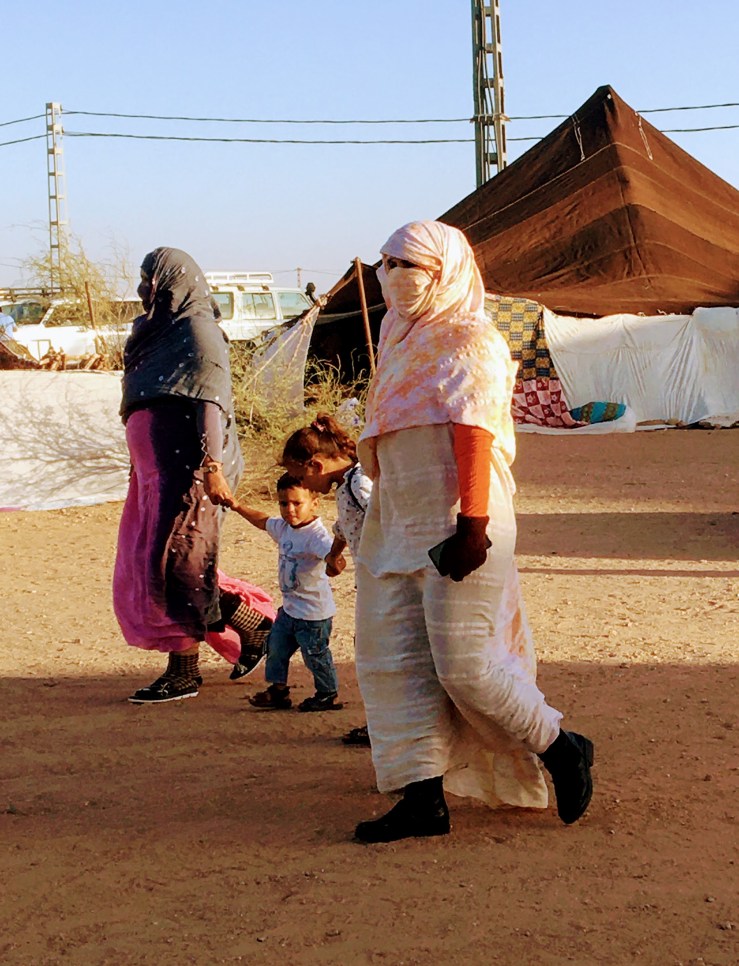 The traditional and mainstay covering-up garment of Sahrawi women is the mihlfa. It consists of a two to three metre stretch of fabric loosely wrapped and draped around the female form – an underdress and or leggings are worn underneath. Additional head fittings will be worn under – though not always, with the inclusion of gloves – all to keep the skin firmly shielded from the harsh and ageing sun. The myriad of uses; from swaddling clothes to throws and picnic blankets, and the full spectrum of colour and patterns add to their unique identity, and joyfully break the visual monotany of sand yellow and sky blue. Young girls go veil-less and Western-style casual until they start menstruating .The societal convention to cover up from the moment they start to bleed an indication that they have entered womanhood.